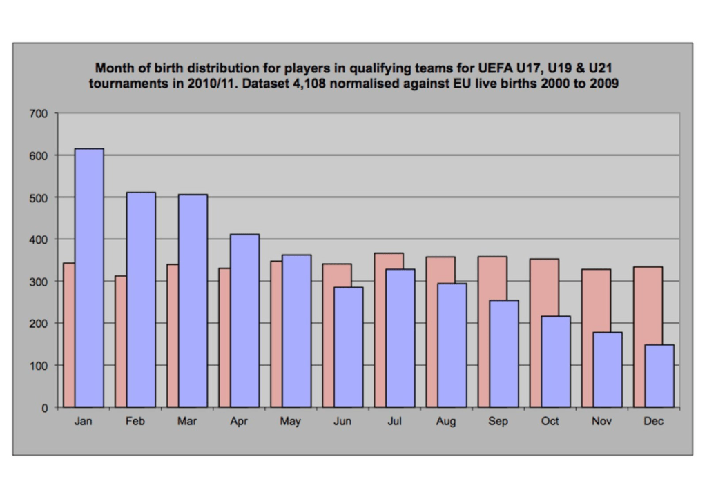 Take elite athletes: top players are commonly born toward the start of their sport’s respective age bracket. This is a small detail, but think about it: if you’re on the fringe of your age bracket you’ll be on average 6 months older than your teammates, and 11 months in some cases. For a child, that’s a leap in physical and mental development. This translates into higher ability at the same “age”.
