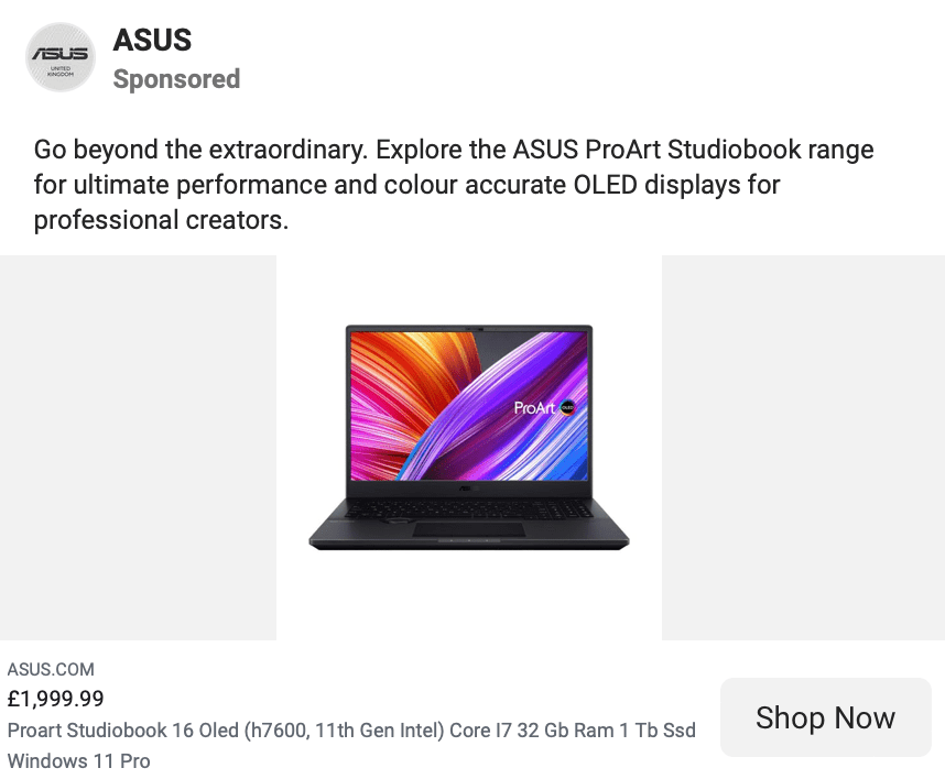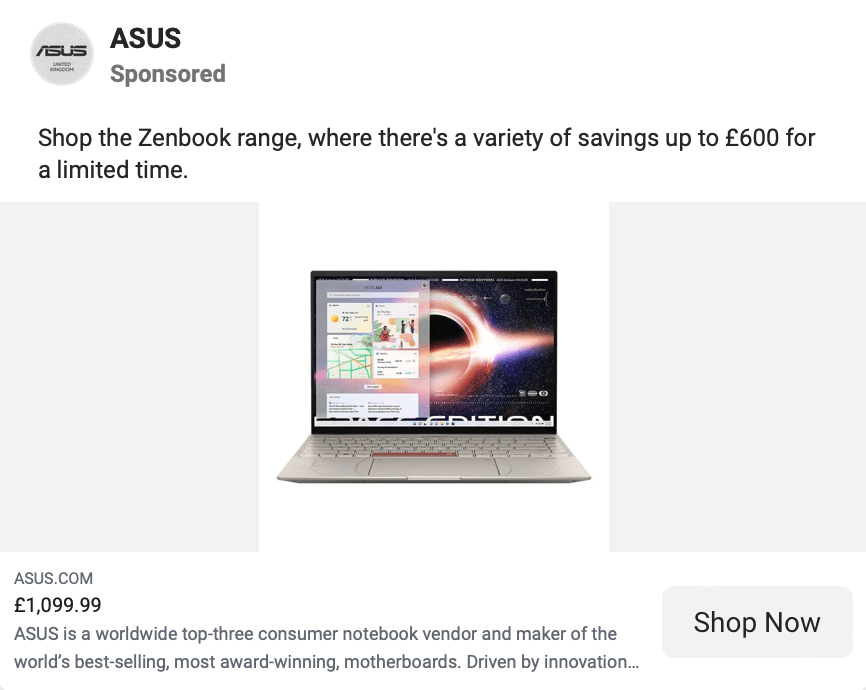 Here’s a better example from ASUS- it’s probably aimed at cold users, but the fact it calls out a specific strength makes it useful for mid-funnel shoppers too.