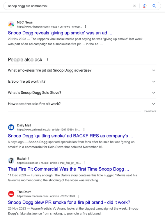 The one thing that’s been commonly missing from this discussion has been the brand name in question- Solo Stoves. Everything is “the fire pit ad” and “the Snoop Dogg video”. Don’t take my word for it, here are the top 4 organic search results for “snoop dogg fire commercial”: