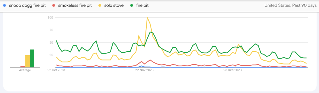 ‘smokeless fire pit’ saw a reasonable spike but it didn’t last- even Snoop couldn’t lessen a clear seasonal drop in interest.
